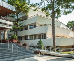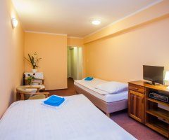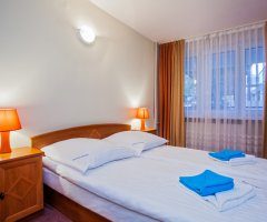 Obiekt dysponuje 300 miejscami noclegowymi w pokojach jedno-, dwu- i trzyosobowych oraz apartamentach. Wszystkie są wyposażone w łazienki, TV satelitarną i balkony.